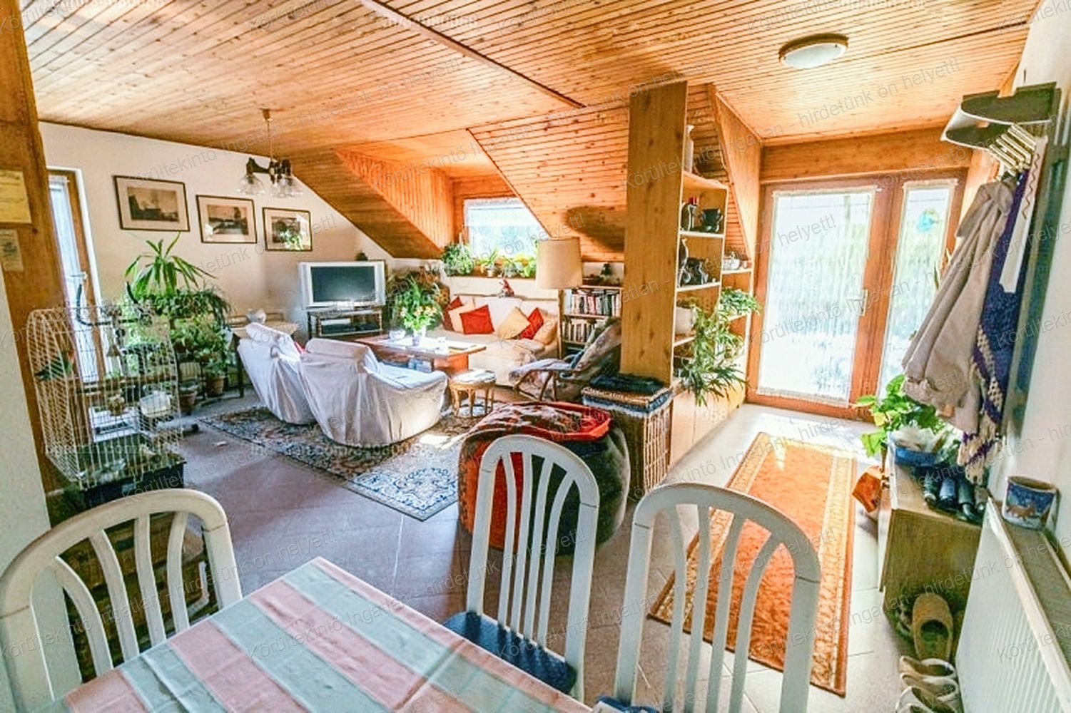 A külön külső lépcsőn megközelíthető tetőtéri lakás 53 nm-es, amerikai konyhás nappali, étkező, egy háló és fürdő elosztású. A lakás két erkéllyel is rendelkezik.
