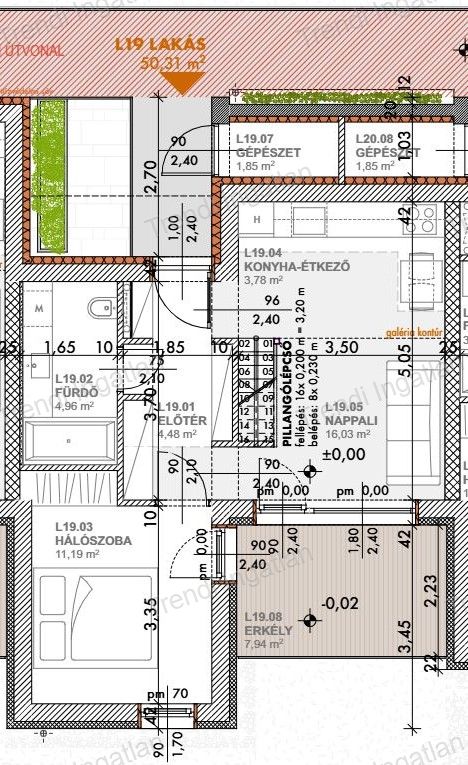 A meghirdetett 1. emeleten található 50,31 nm-es lakásban az alsó szinten amerikai konyhás nappali, szoba, fürdőszoba és előtér található. Nappaliból 7,94 nm-es erkély nyílik. A nappaliból vezető lépcsőn keresztül érhető el a galéria, ami akár hálószobának is alkalmas.