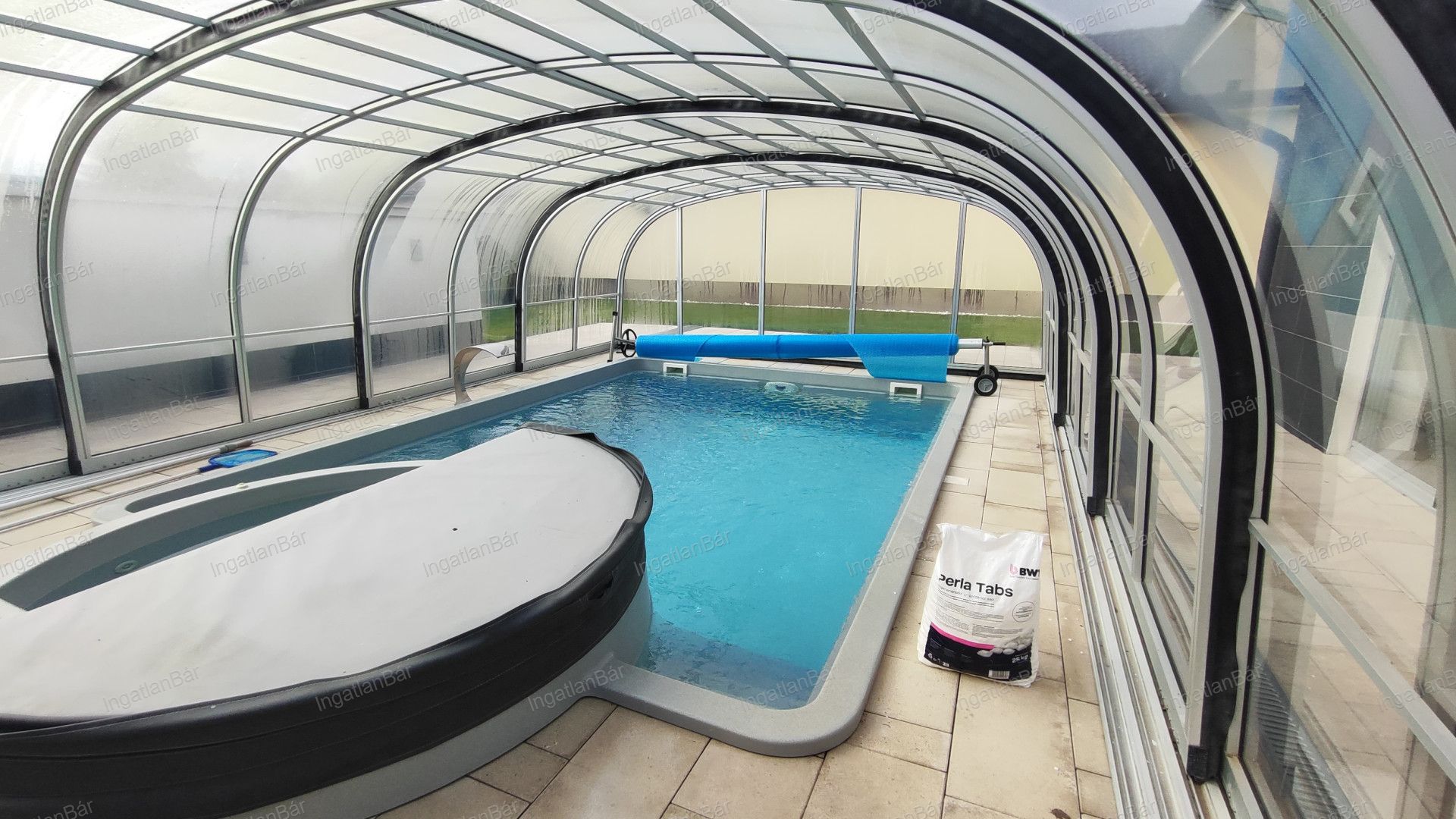 Hőszivattyús, ellenáramoltatós medence nyakzuhannyal, automata vegyszeradagolóval és fedéssel — télen is használható