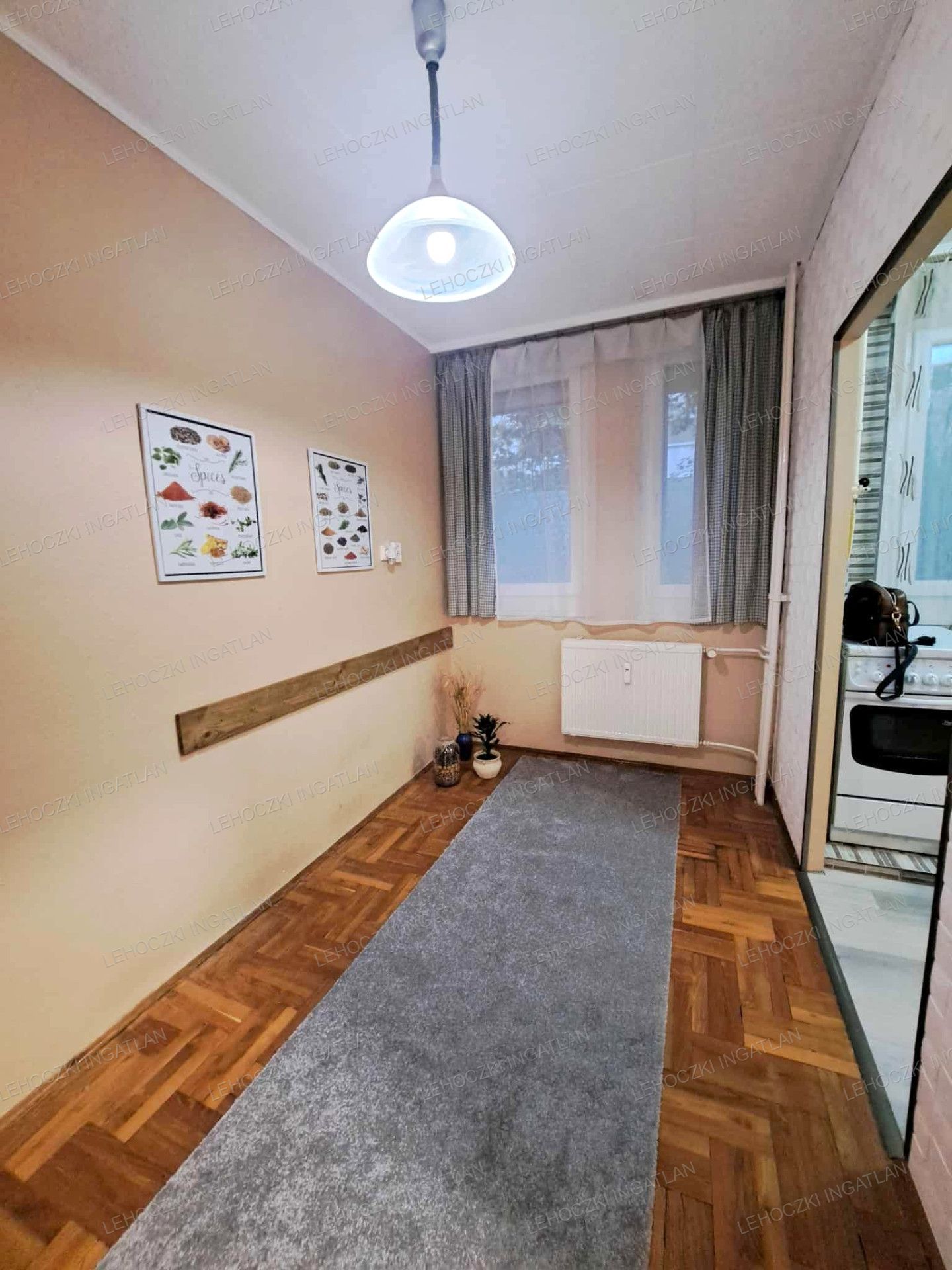 szobákban, étkezőben parketta, konyhában, előtérben, közlekedőben vízálló vynil padló, többi helyiségben kerámia burkolat,