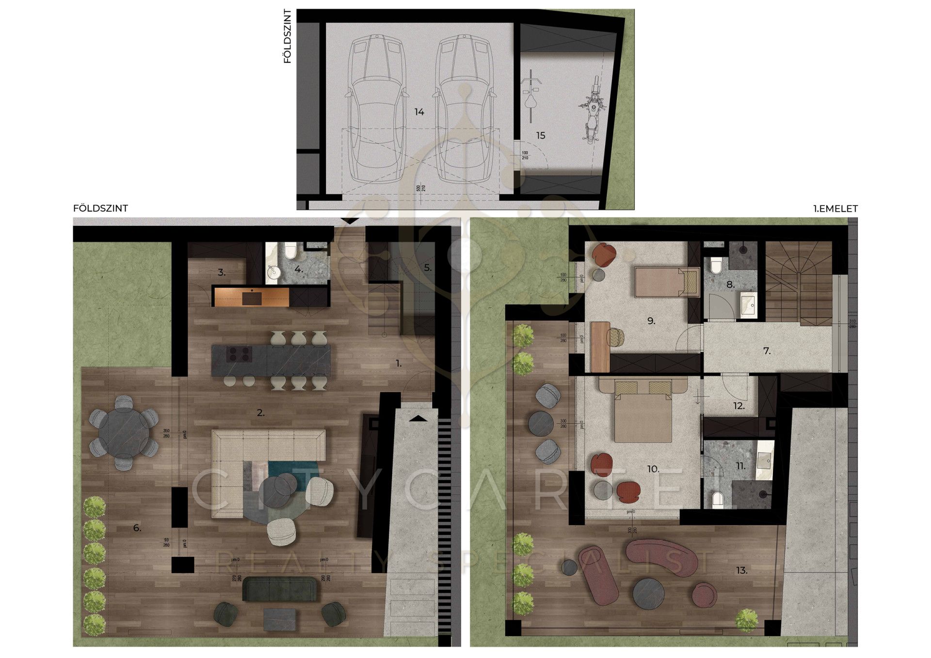 A belső 2 szintes, 3 szobás lakás alapterülete 123 nm, melyhez 88 nm-es fűthető terasz, és 253 nm parkosított kert tartozik. Az ingatlan számos modern kényelmi és biztonsági funkcióval rendelkezik. Az elektromosan állítható zsalúziák és a mennyezet-hűtés, padló-fűtés gondoskodnak a kényelmes klímáról bármely időjárási körülmények között. A szellőztető rendszer friss levegőt biztosít, míg a fűthető nagyméretű faburkolatos teraszokon kellemes időtöltést nyújtanak akár a hűvösebb napokon is. A parkosított kert öntözőrendszerrel ellátva gondoskodik a zöld környezetről, melyet az épített tűzrakók egészítenek ki.
